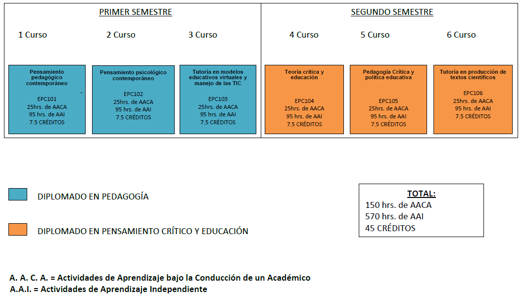 La especialidad en Pedagogía Crítica está organizada en dos diplomados con un valor total de 45 créditos. La especialidad se cursa en dos semestres con una duración ordinaria de un año. Los diplomados que componen la especialidad son: Pedagogía y Pensamiento crítico y educación.